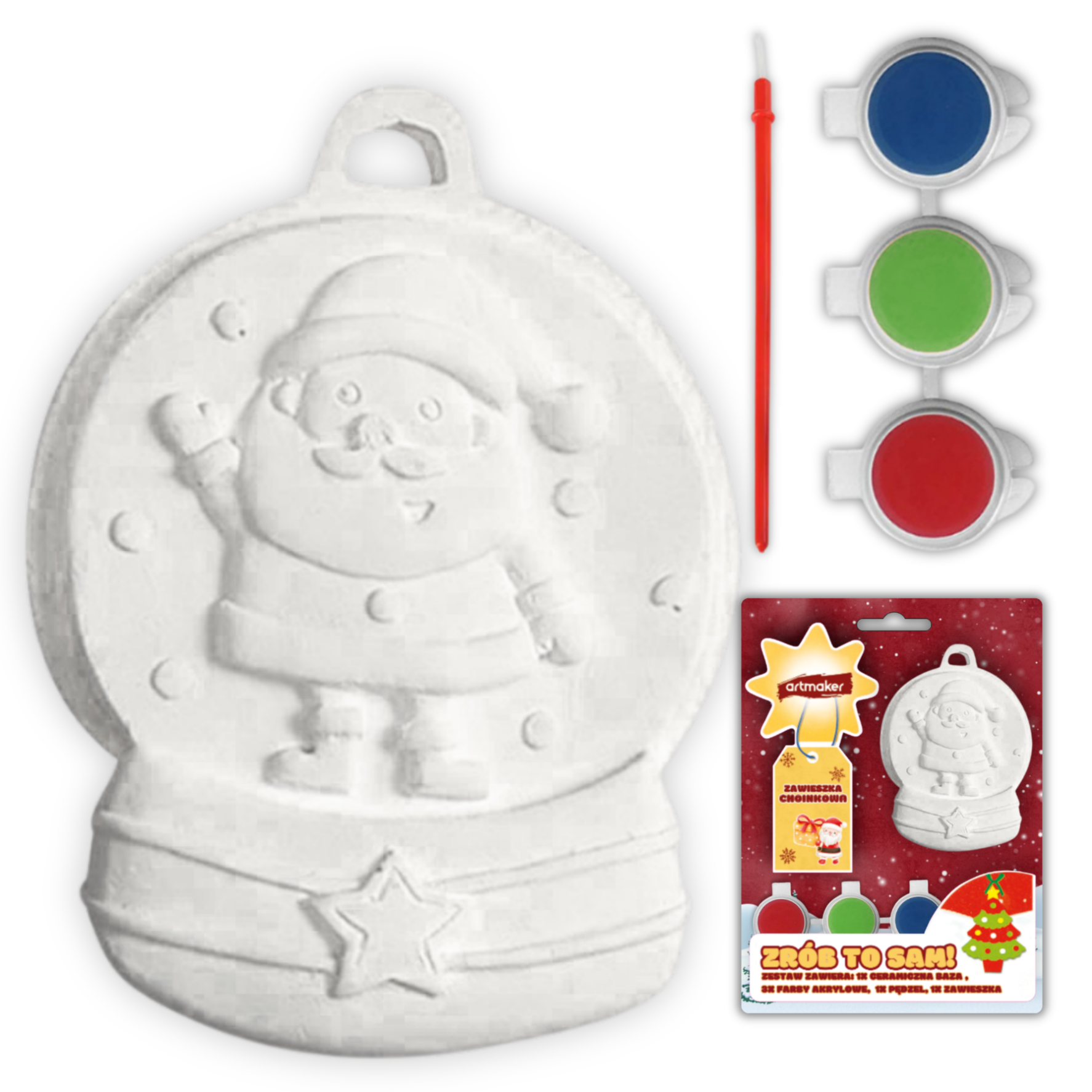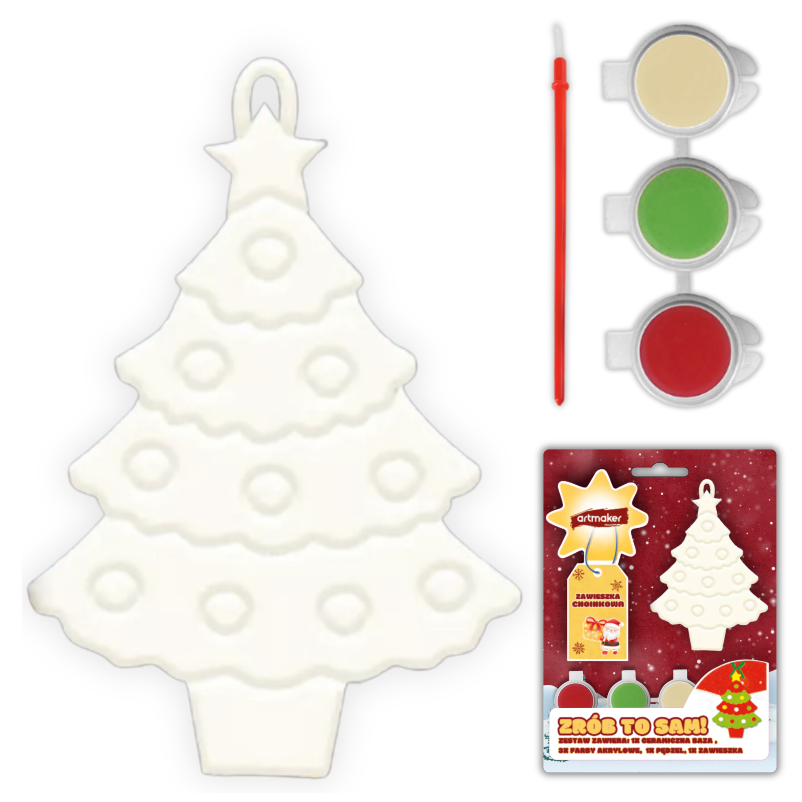 - Zawartość zestawu: Gipsowe zawieszki w kształcie choinki i kuli śnieżnej, dwa zestawy farb akrylowych (czerwony, zielony, beżowy oraz czerwony, zielony, niebieski), dwa pędzelki