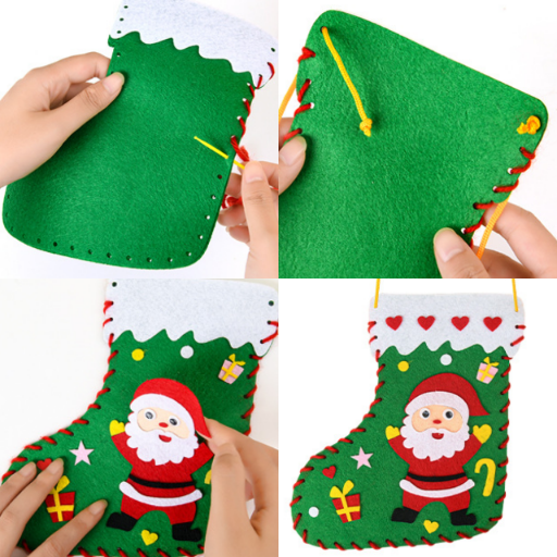 - Zawartość zestawu: 2 bazy skarpet (czerwona i zielona), samoprzylepne dekoracje, sznurek do szycia, plastikowe igły