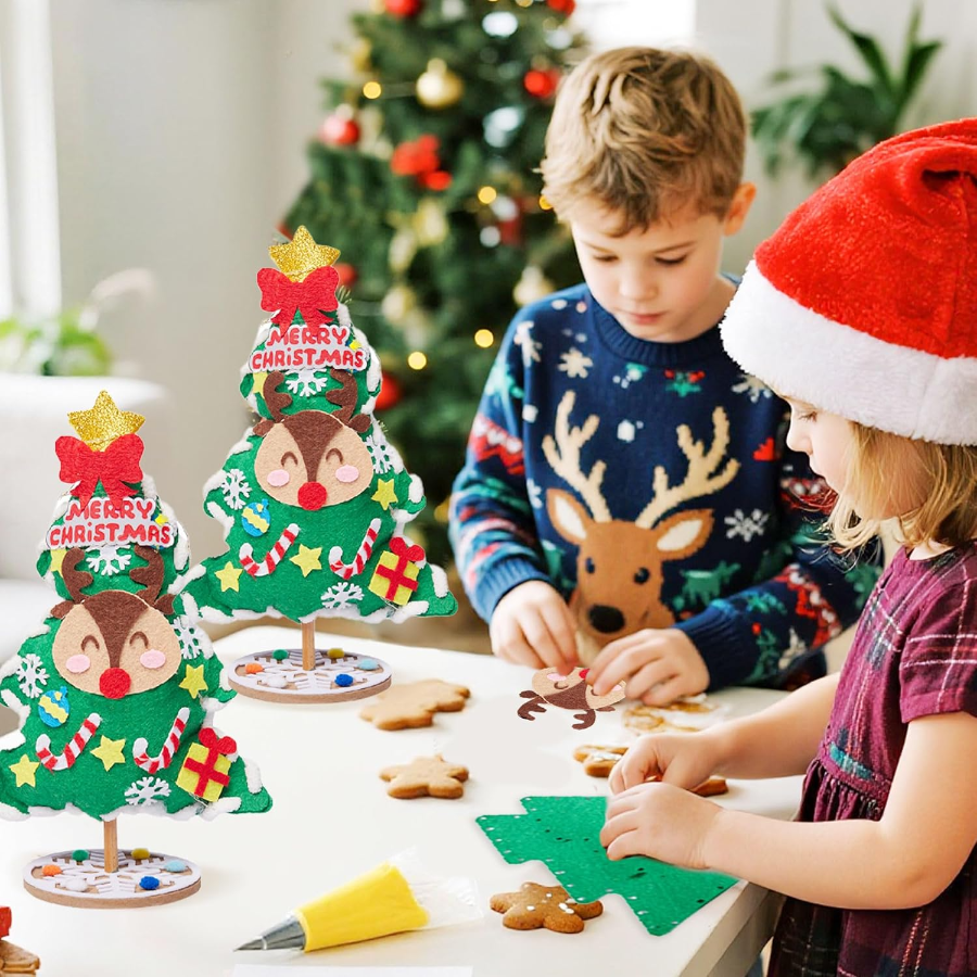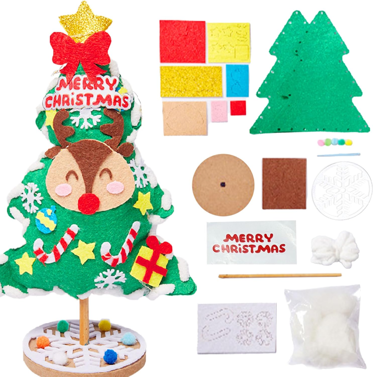 ✅ Zestaw samoprzylepnych ozdób z filcu – zawiera m.in. renifera, napis Merry Christmas, gwiazdki, prezenty, laski cukrowe, bombki i śnieżynki