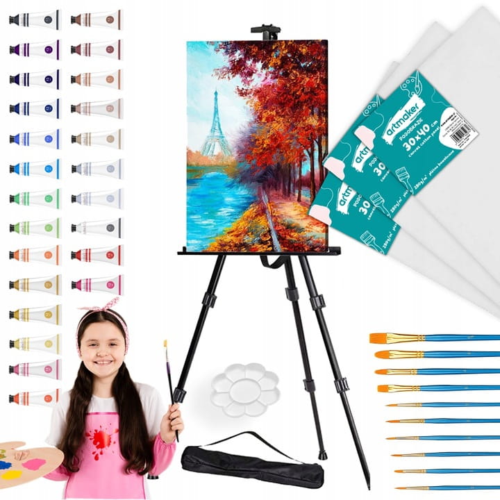 ✔️Kompletny zestaw – znajdziesz w nim wszystko, czego potrzebujesz, aby stworzyć własne dzieło: sztalugę, farby, pędzle, płótna i paletę.