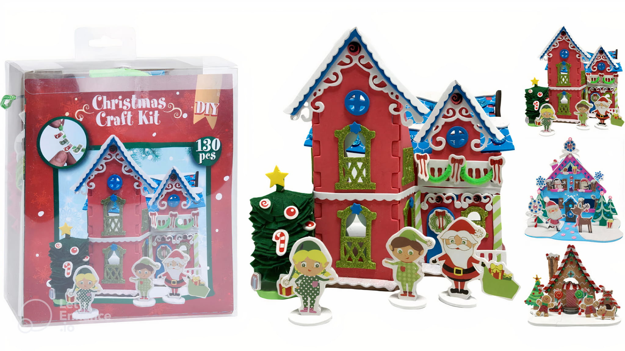 Zestaw piankowy domek 3D 189 elementów łączy funkcje edukacyjne z świąteczną zabawą. Może być wykorzystywany podczas zajęć plastycznych w przedszkolach i szkołach lub jako aktywność domowa w rodzinnym gronie. Idealnie nadaje się na prezent świąteczny lub jako element kalendarza adwentowego.
