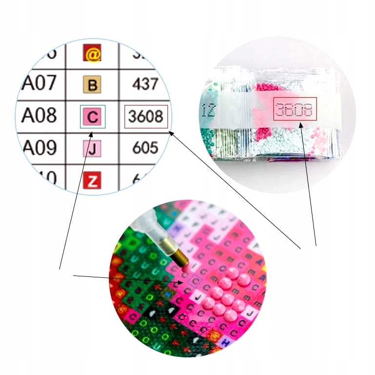- zestaw 15 000 kolorowych diamentów ponumerowanych liczbami, niezbędne do wykonania obrazu