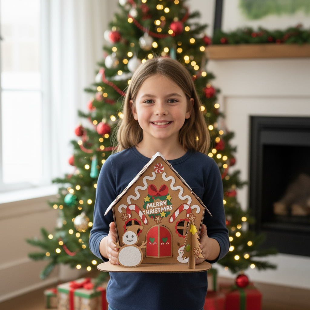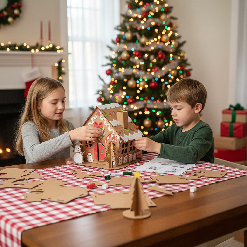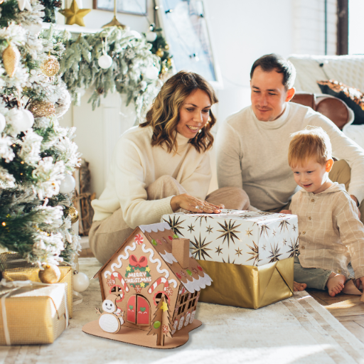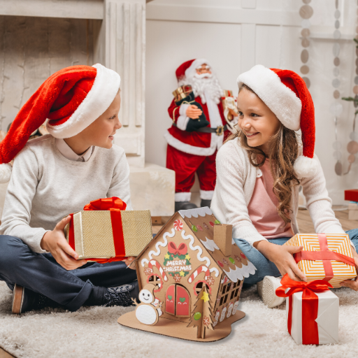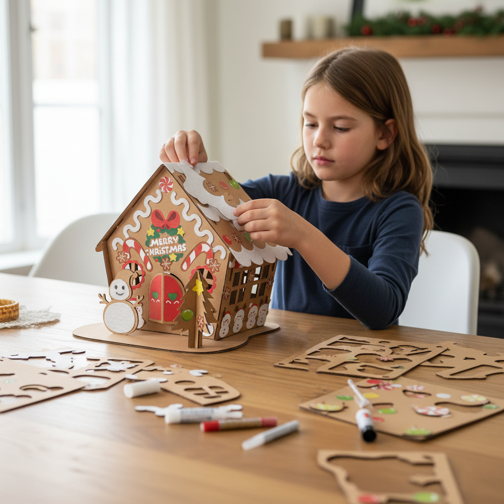 Zestaw pozwala dzieciom na samodzielne składanie oraz dekorowanie domku według własnego pomysłu. Można ozdobić go naklejkami dołączonymi do zestawu lub własnymi dodatkami, tworząc unikalny projekt. Gotowy domek doskonale prezentuje się jako dekoracja świąteczna, ozdoba pokoju lub element paczki mikołajkowej.